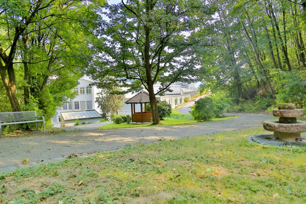Ruhe und Entspannung im Grünen mit kleinen Spazierwegen und überdachten Sitzgelegenheiten finden Sie in unserem Klinikpark.
