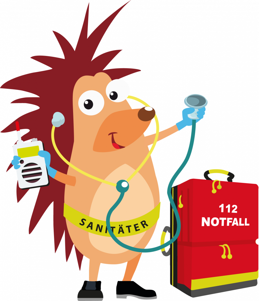 - Inhalt: Mit einer illustrierten Geschichte (Kamishibai) von Igelchen und seinen Freunden lernen die Kleinen spielerisch und kindgerecht den ersten Umgang mit einer Notfallsituation. Dabei lernen und merken sie sich die Notrufnummer, üben das Absetzen eines Notrufs, bekommen die Bestandteile eines Verbandkastens und die Wundversorgung durch Pflaster und Verbände gezeigt.