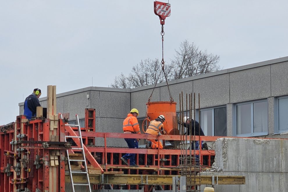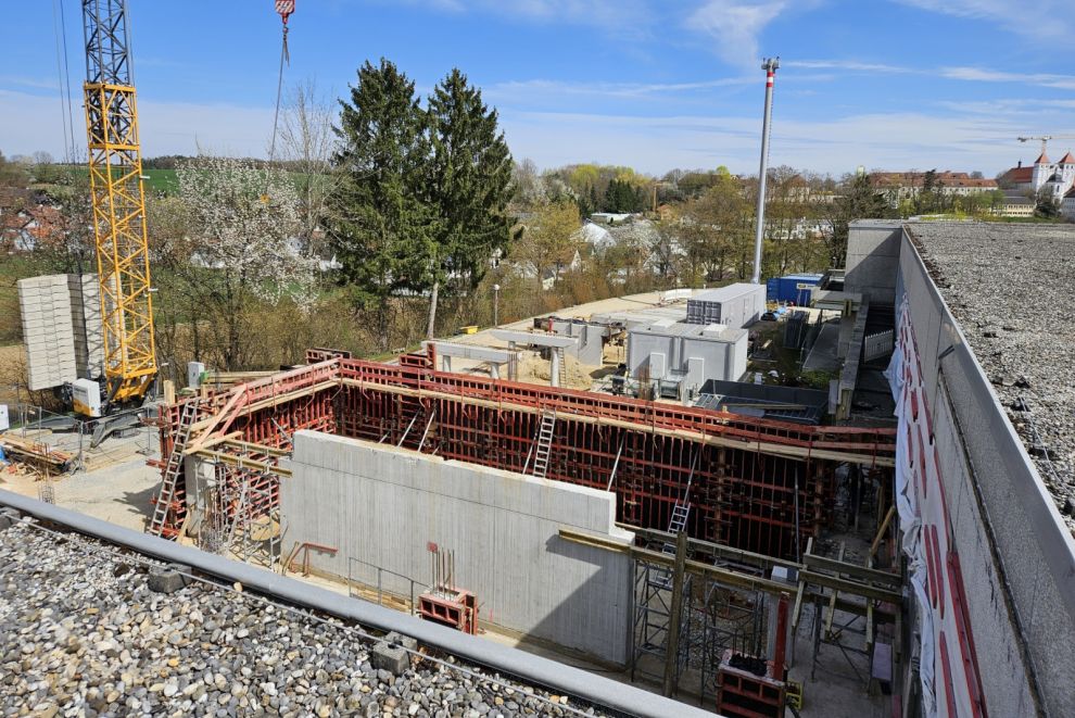 Die Arbeiten sind nach der Winterpause am 23.2.2026 wieder angelaufen, ein Kran ist im Einsatz und es hat sich sichtlich etwas getan: Die Fundamente für die Rampe werden erstellt, ebenso die Betonwände für die Garagen mit neuen Tragepfeilern für die Betondecke im Wirtschaftshof. Das bestehende Bauteil der Notaufnahme wird anschließend vorbereitet zum Betonieren der Gesamtfläche mit Decke Wirtschaftshof in einem Guss.
