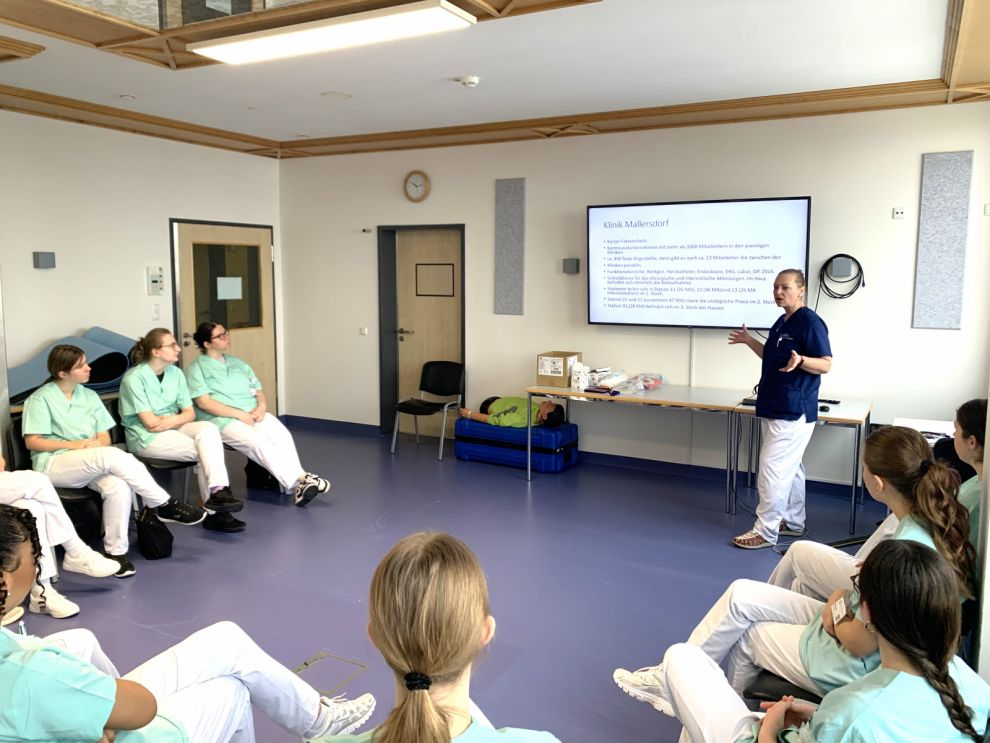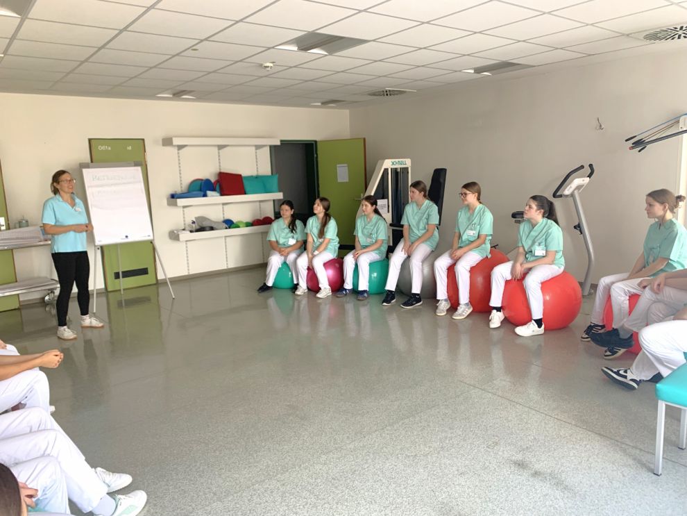 Ein vielfältiges Programm mit Einblicken in verschiedenste Klinikbereiche, aktiven Mitmach- und Reflexionsübungen hatten die Praxisanleiterinnen der Klinik Mallersdorf Lisa Steinberger und Daniela Fischer mit Pflegedienstleiter Andreas Schneider und Marina Eichmeier vom Sekretariat der Pflegedirektion auf die Beine gestellt. Professionell eingekleidet waren die Praktikantinnen von Beginn an ins Klinikteam integriert. Der Ankunftstag beinhaltete nach dem gegenseitigen Kennenlernen gleich auch den ersten praktischen Unterricht, eine Hygieneeinweisung durch die Hygienefachkraft Nicole Müller, eine Hausführung zur Orientierung, Erklärung der Patientenzimmer und Einblicke in die Gesundheitsprävention mit der Leitung der Physiotherapie Lenka Drlikova. Je nach individuellen Interessen konnten die Praktikantinnen auf Ihrer Wunschstation im Dienst mitwirken.